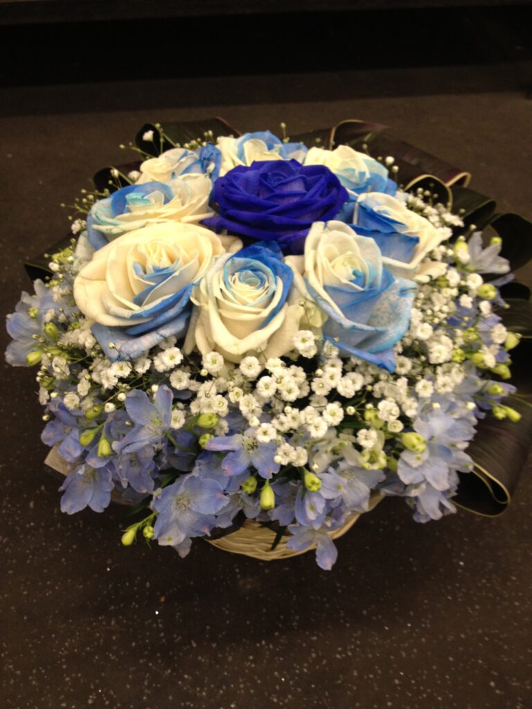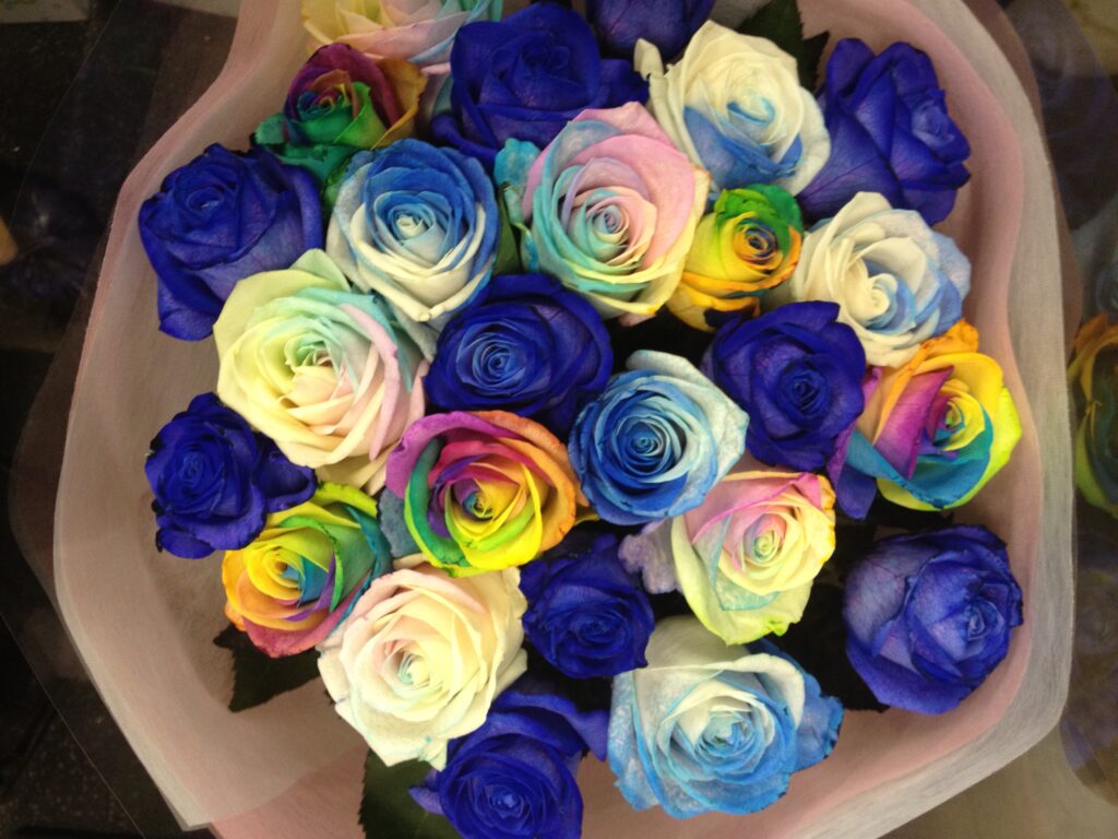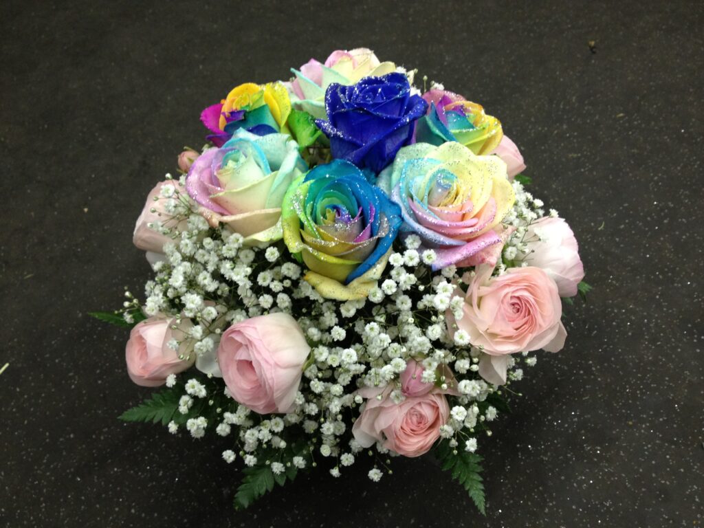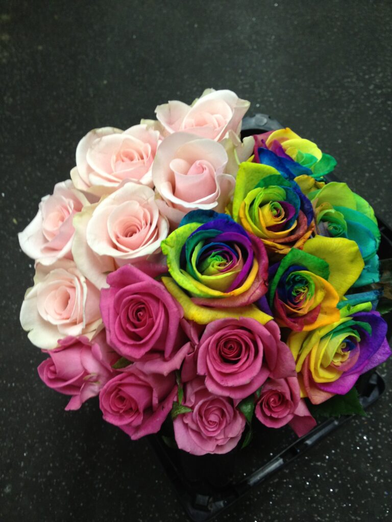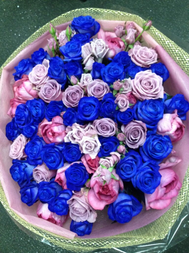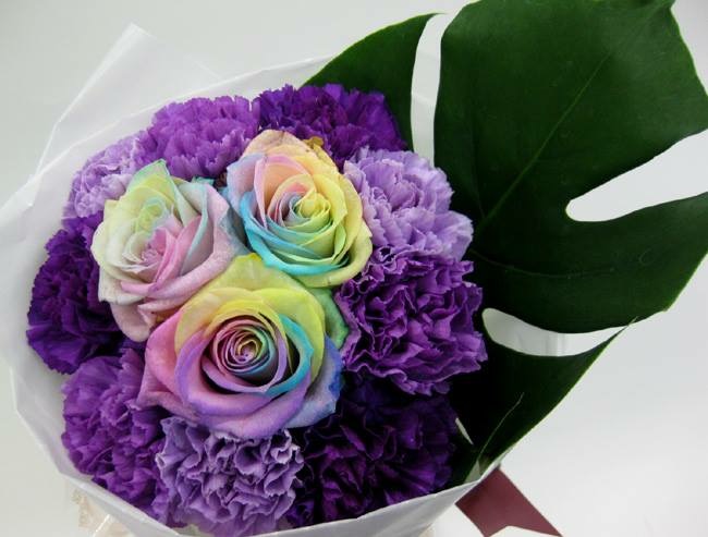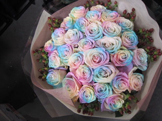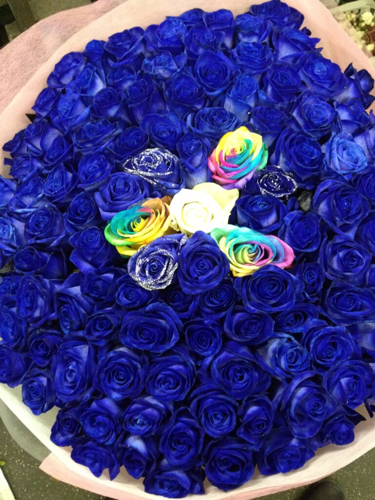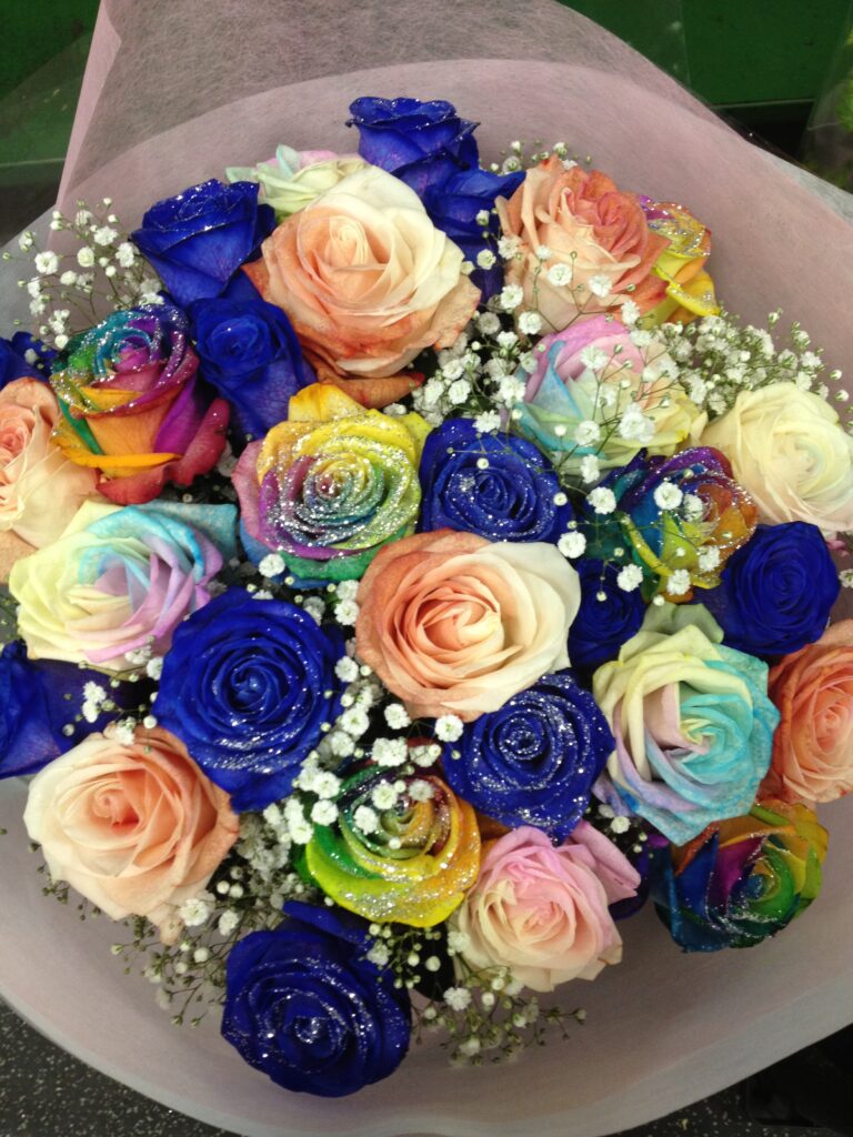 バラのあらゆる色、形、青いバラ、レインボーローズを花束、アレンジでお届けしました。