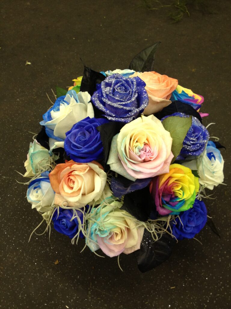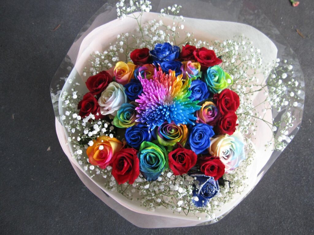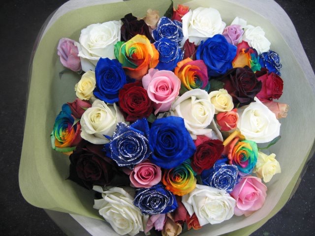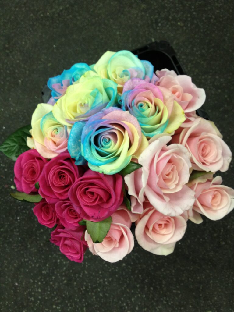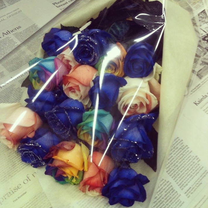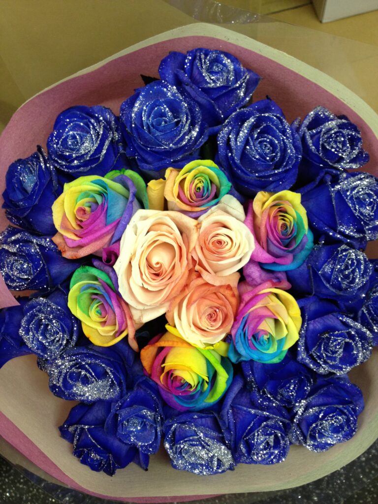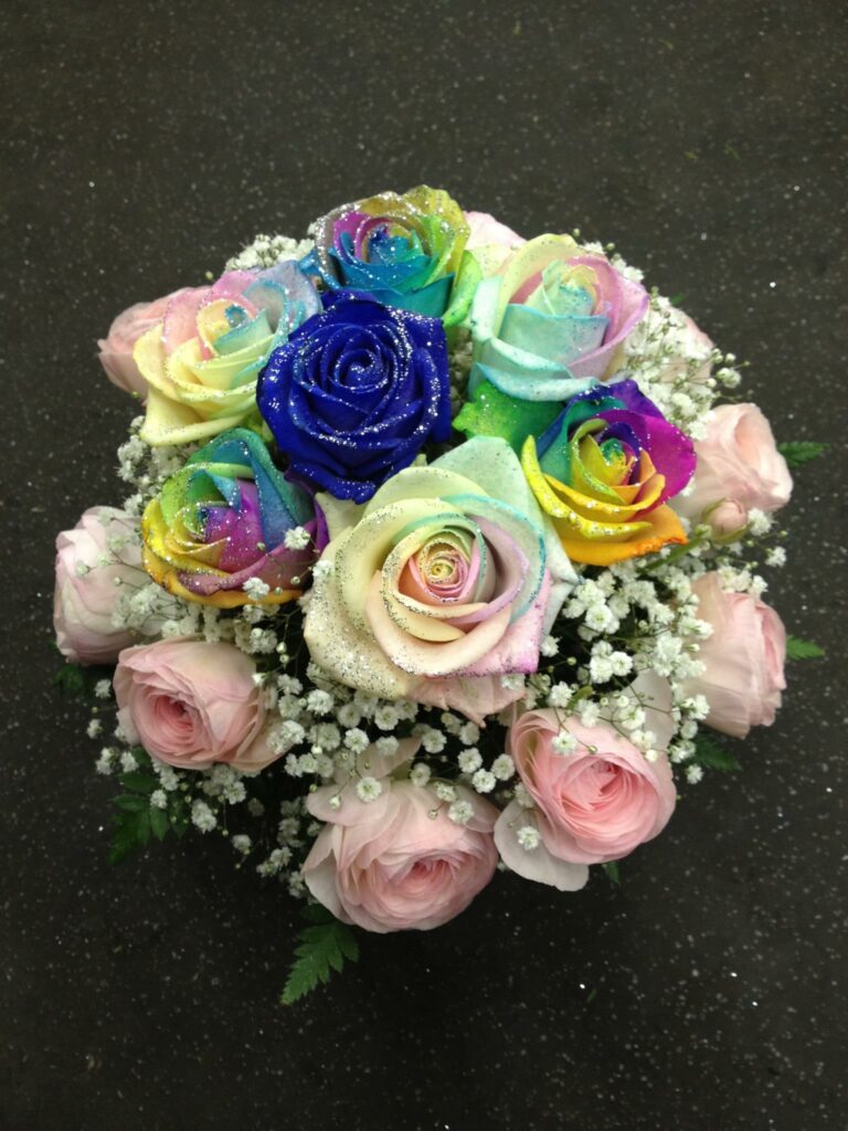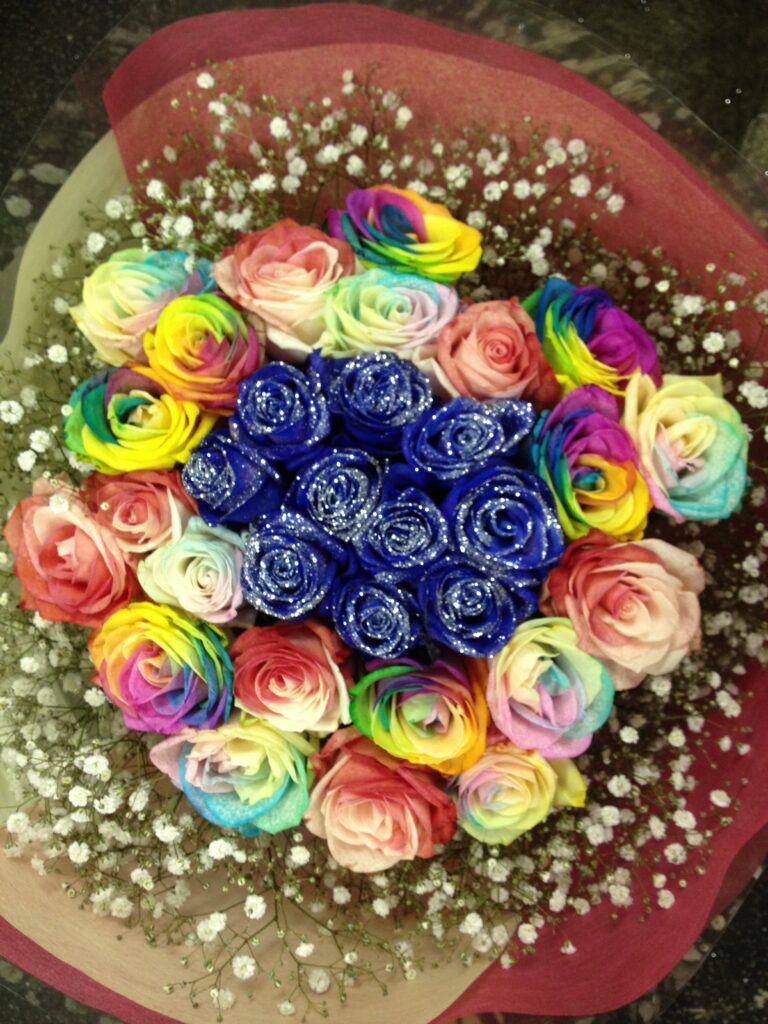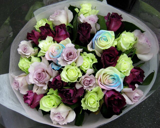 バラのあらゆる色、形、青いバラ、レインボーローズを花束、アレンジでお届けしました。