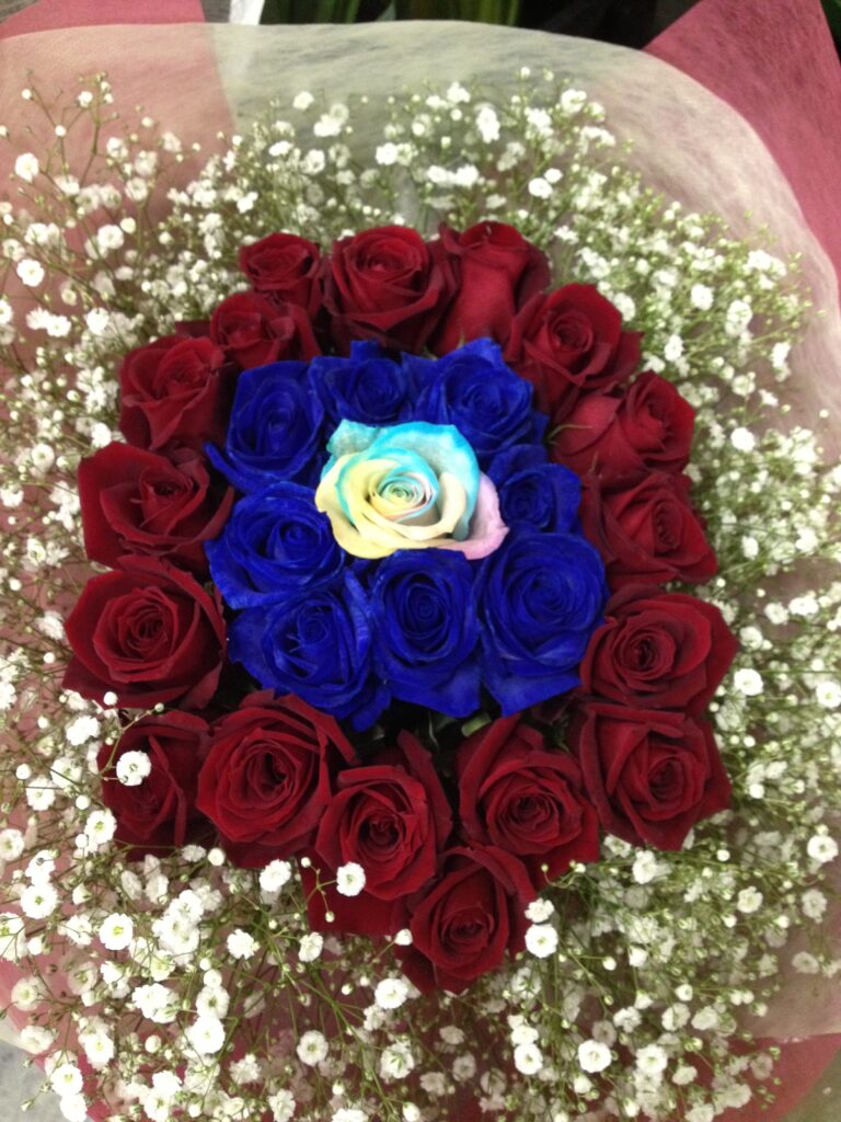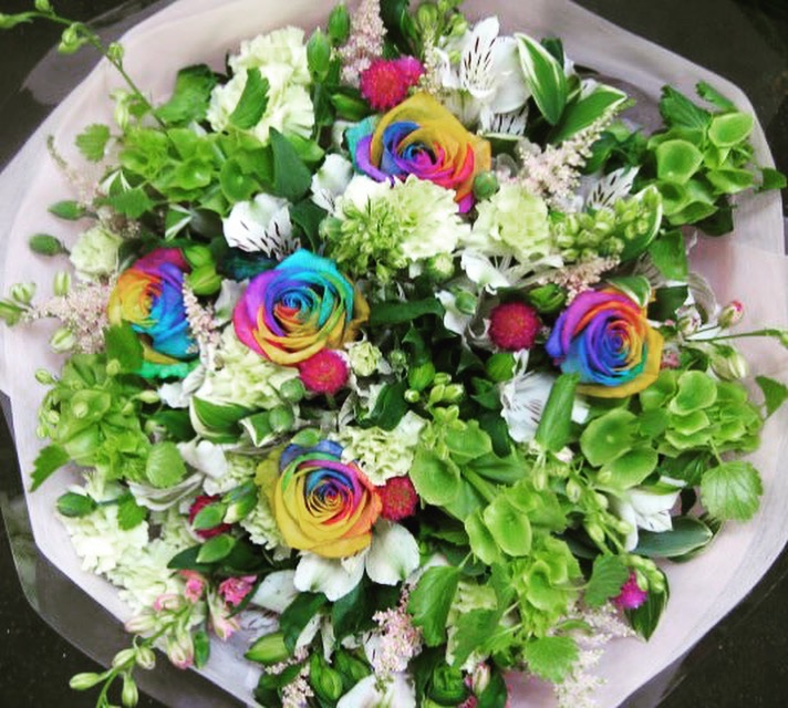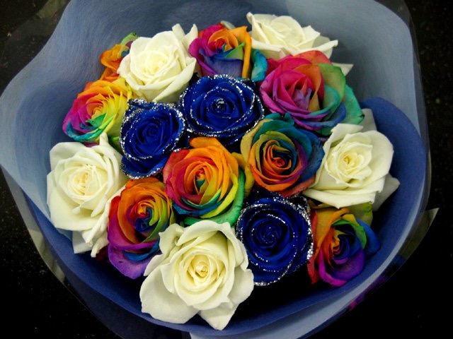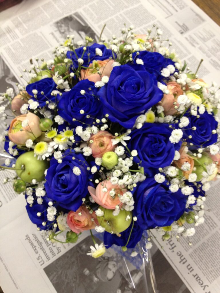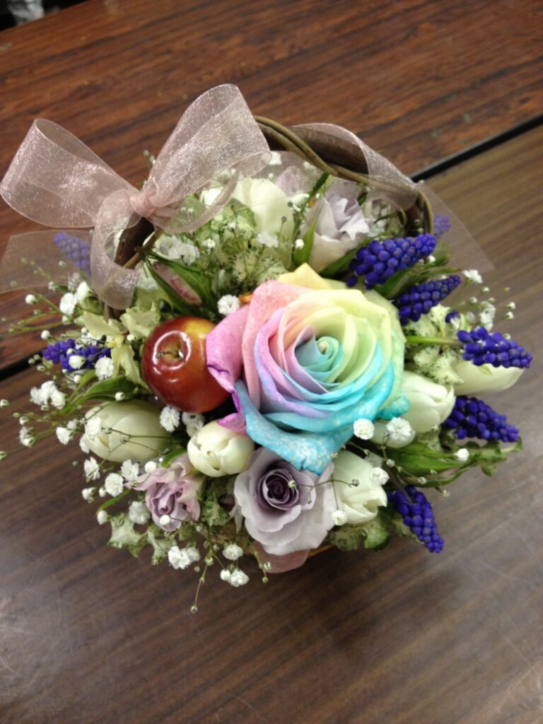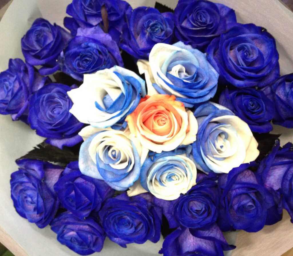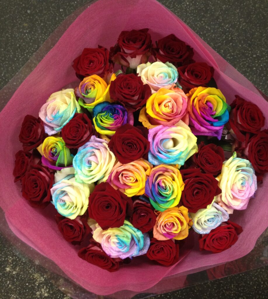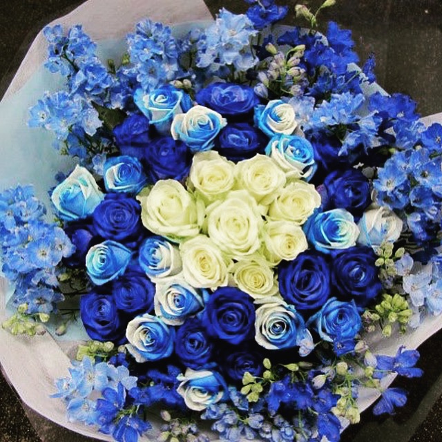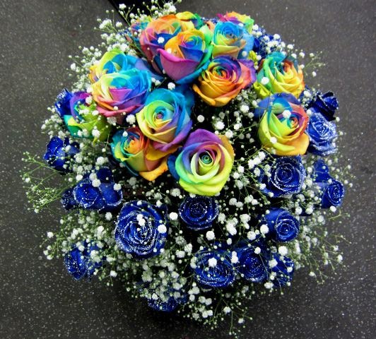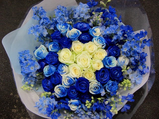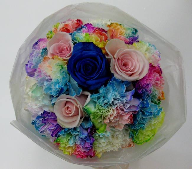 バラのあらゆる色、形、青いバラ、レインボーローズを花束、アレンジでお届けしました。