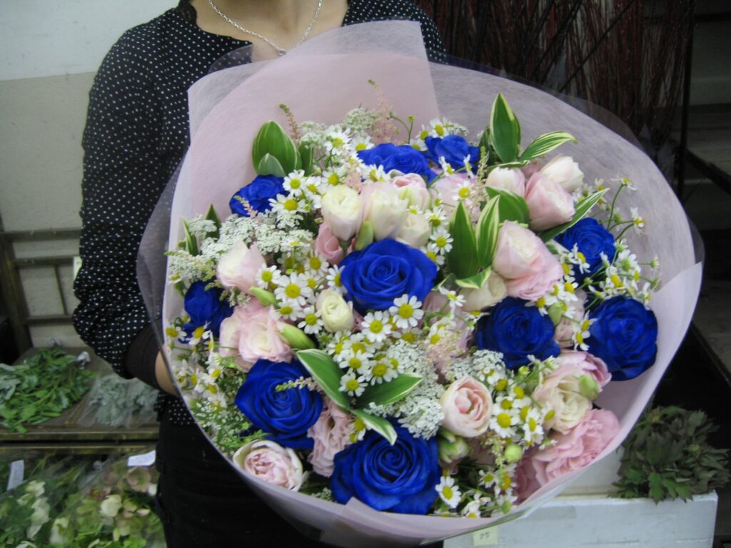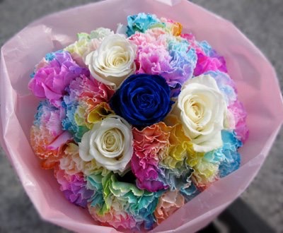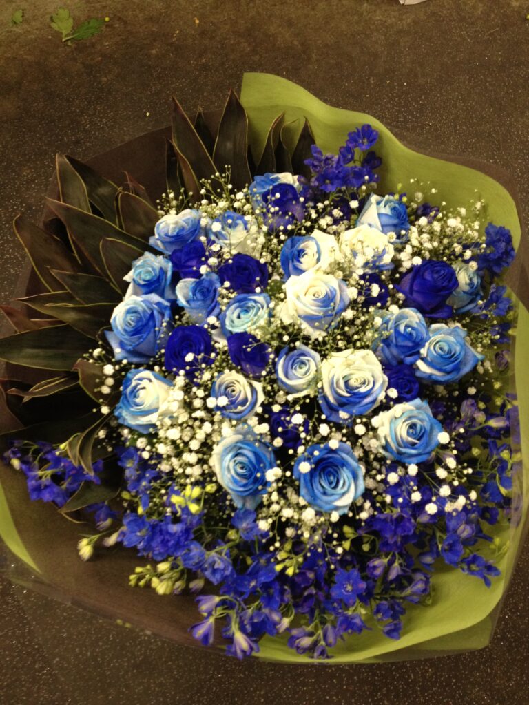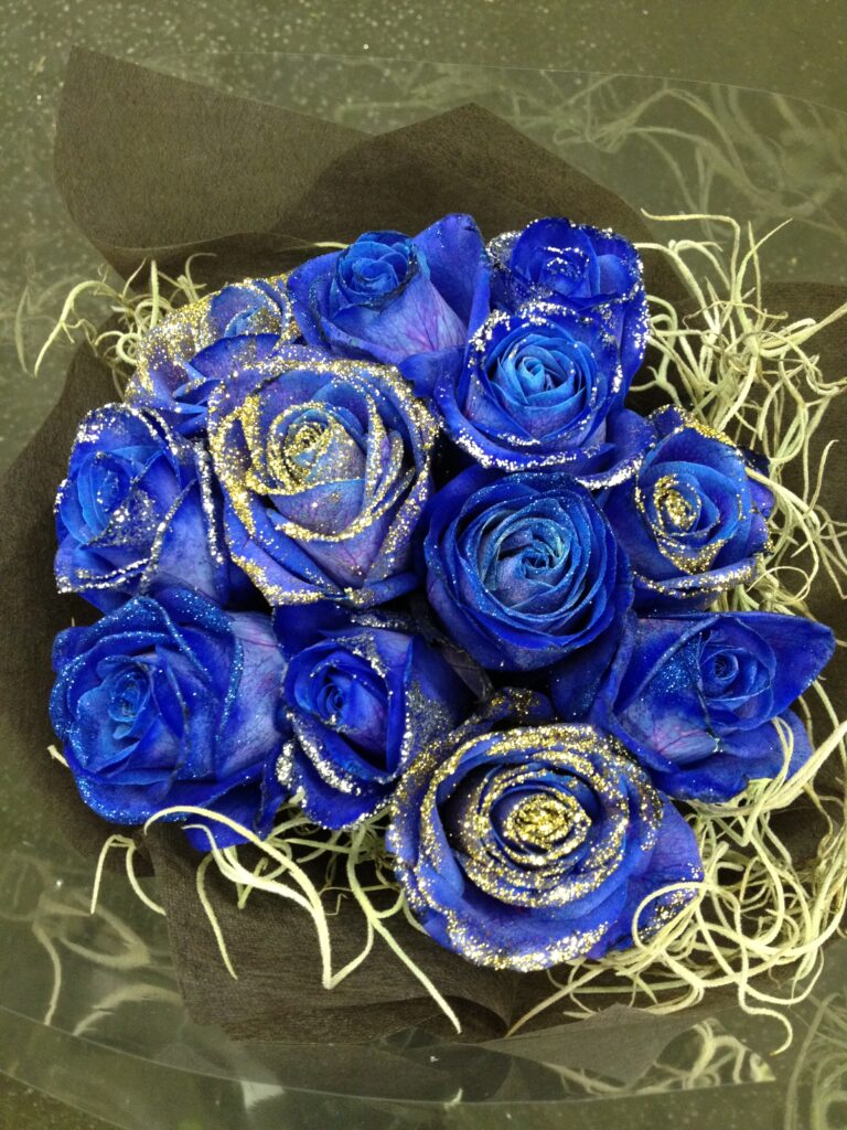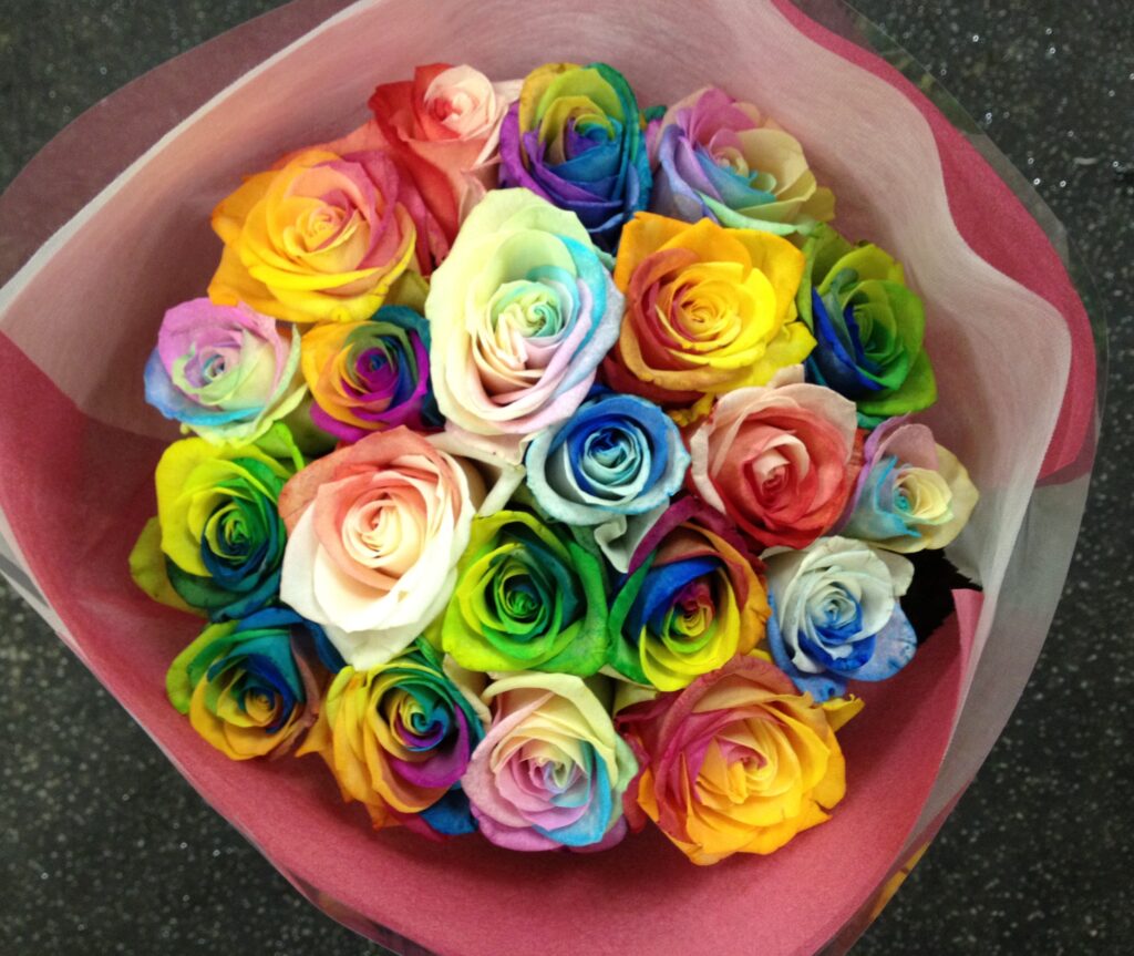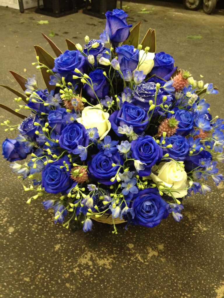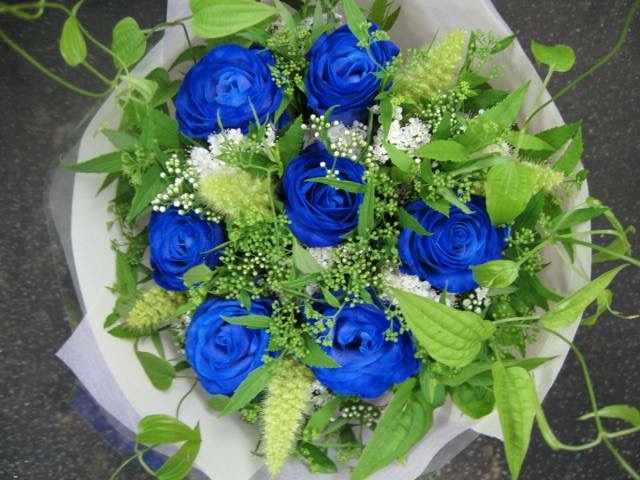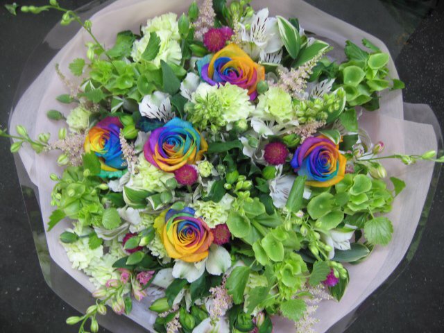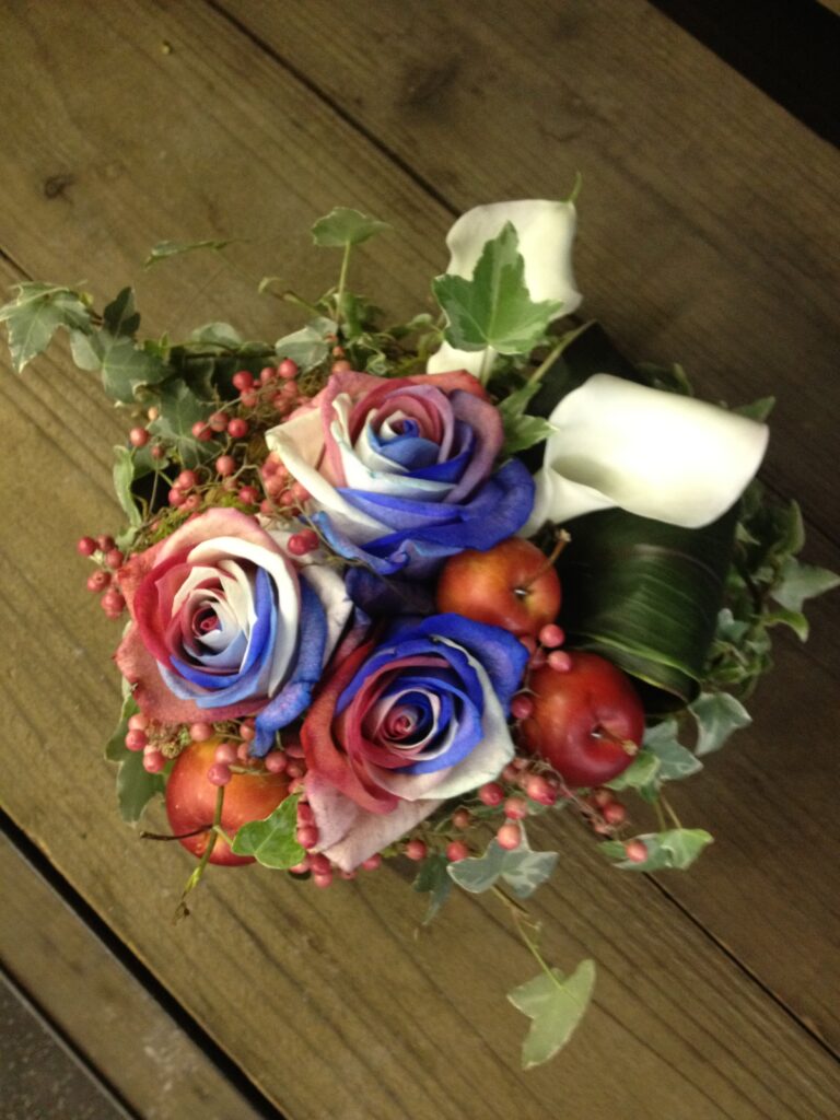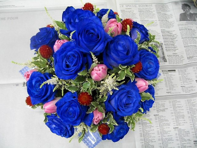 バラのあらゆる色、形、青いバラ、レインボーローズを花束、アレンジでお届けしました。