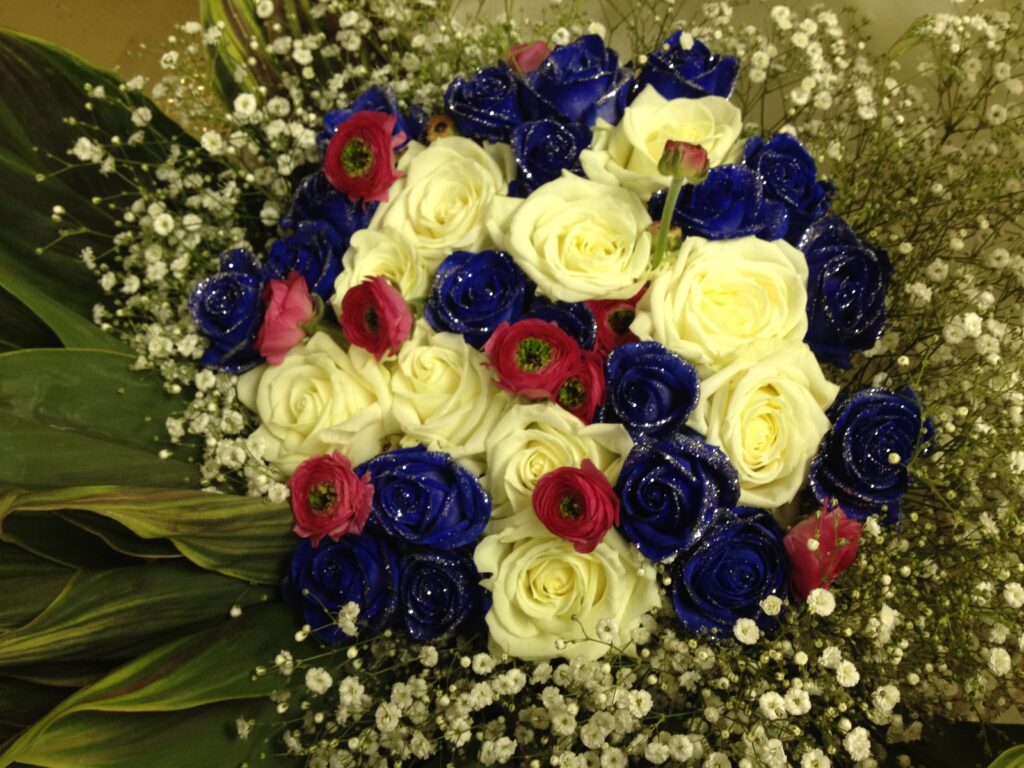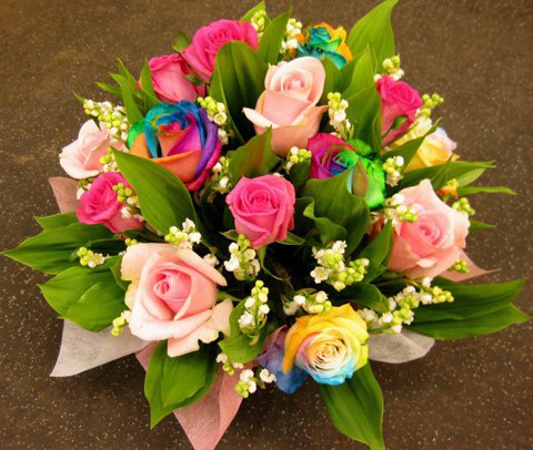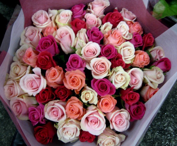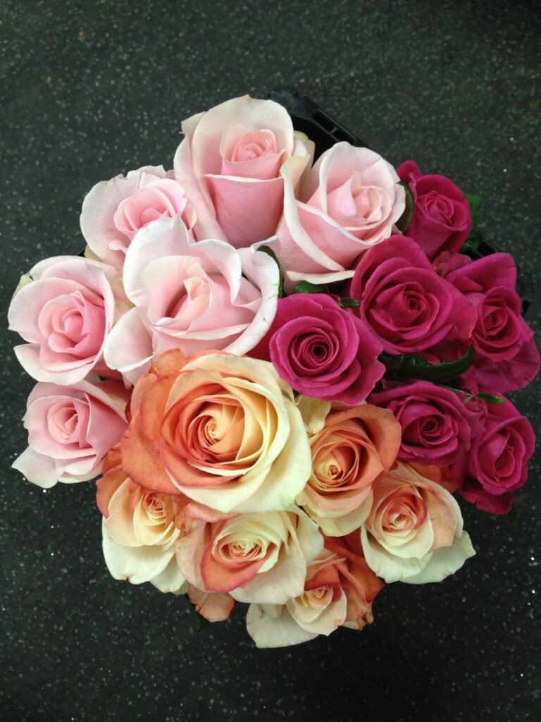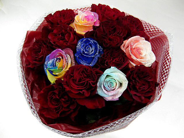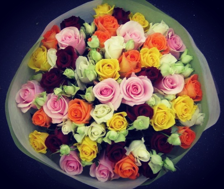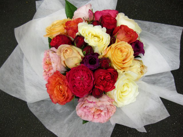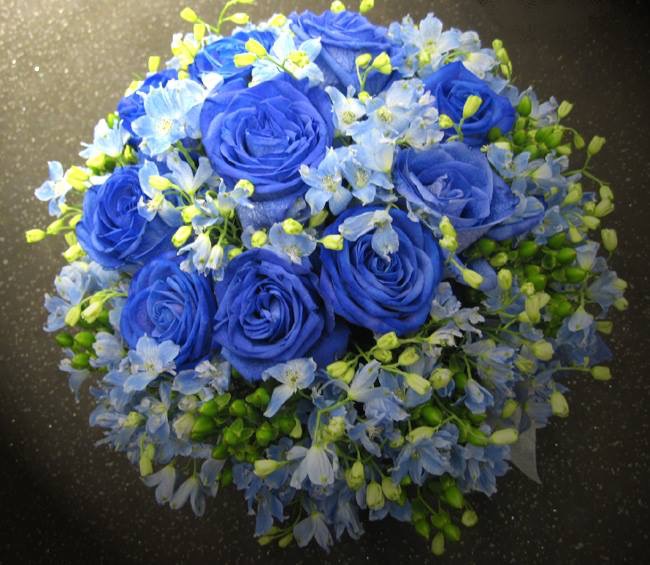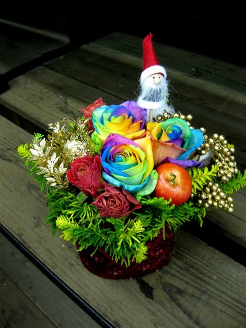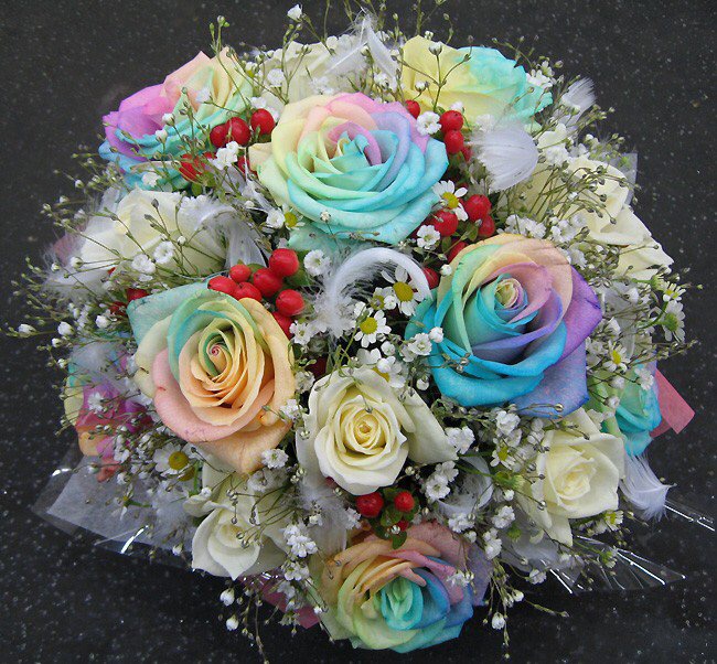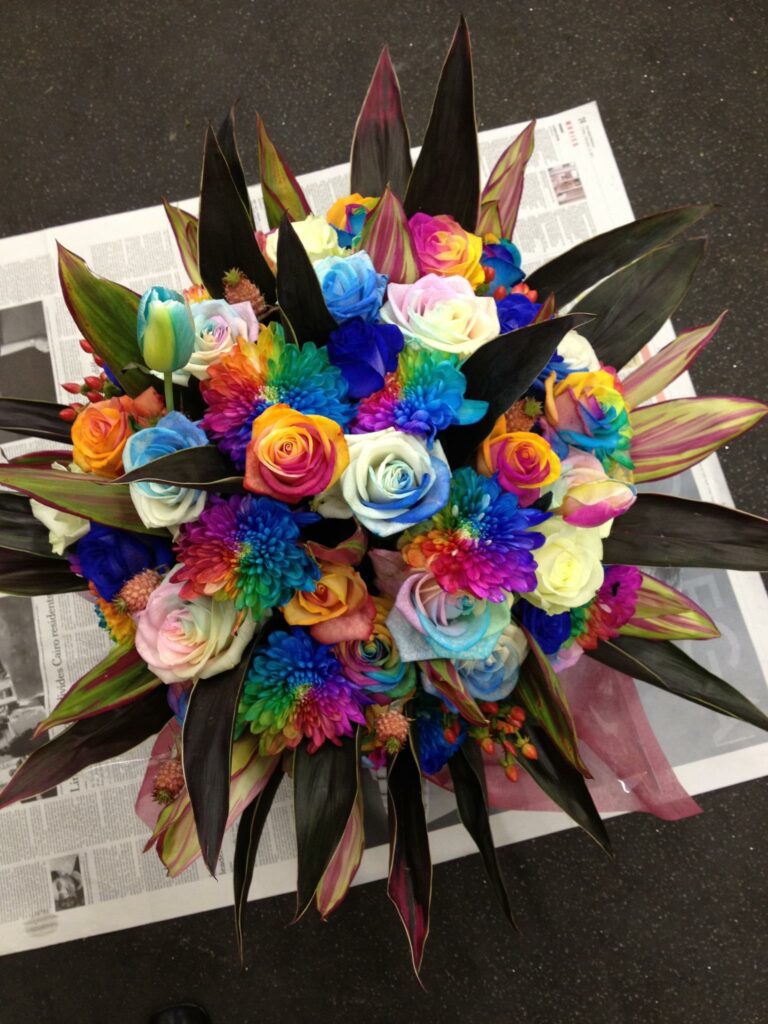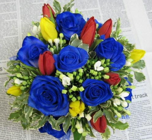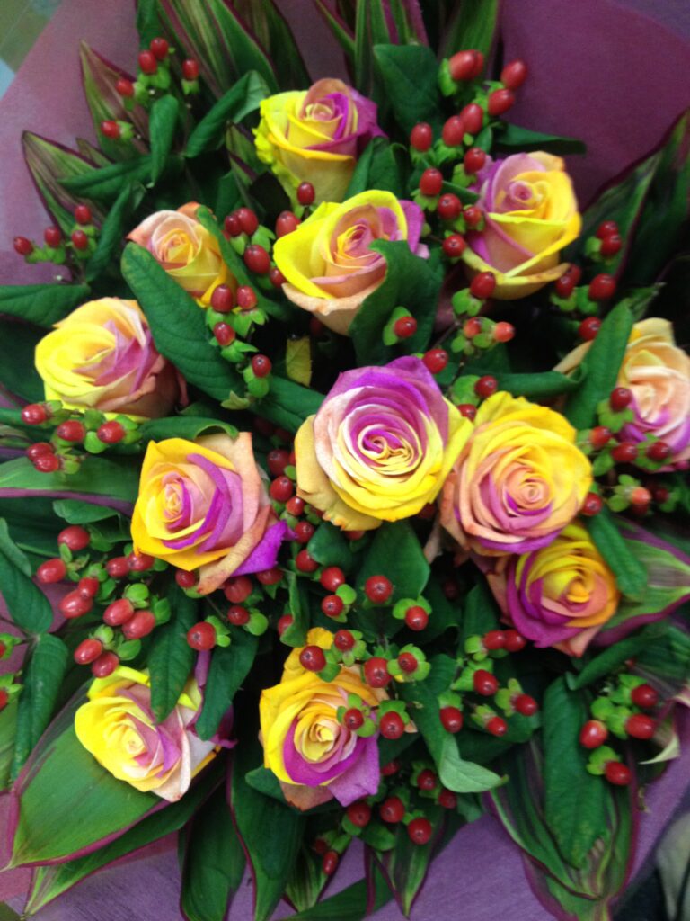 バラのあらゆる色、形、青いバラ、レインボーローズを花束、アレンジでお届けしました。