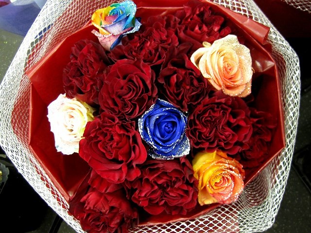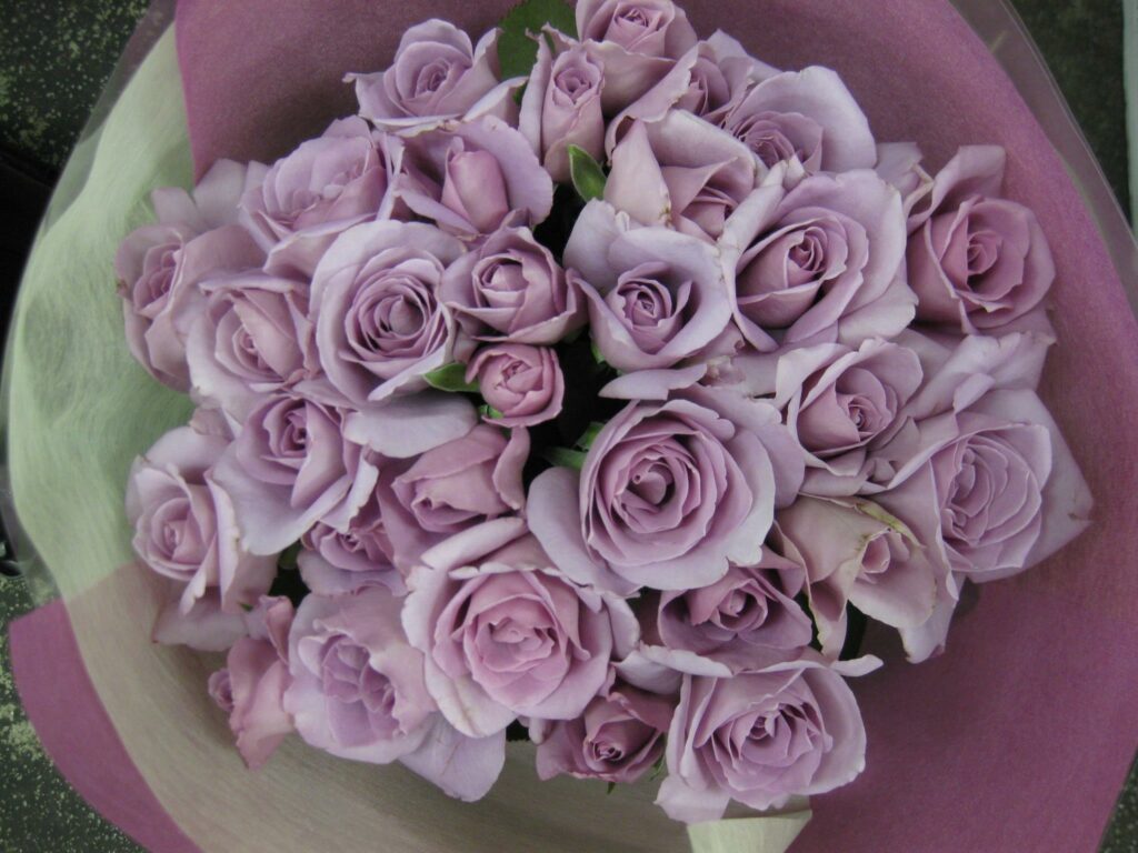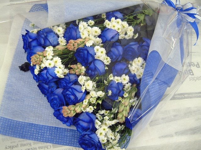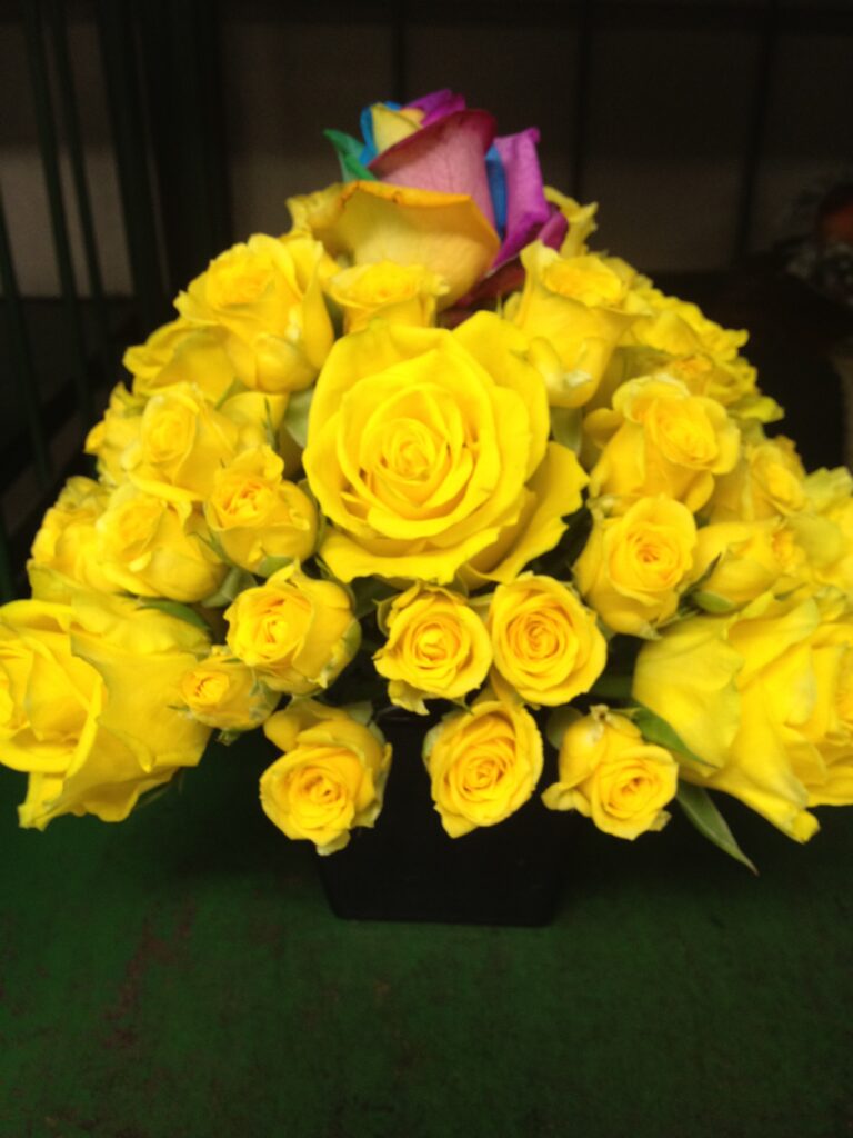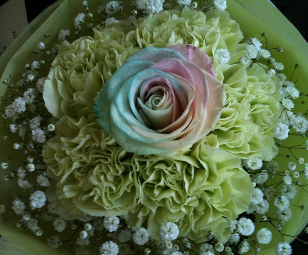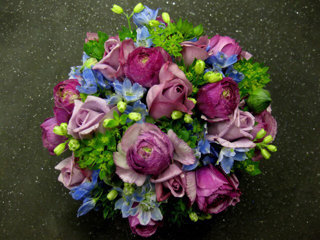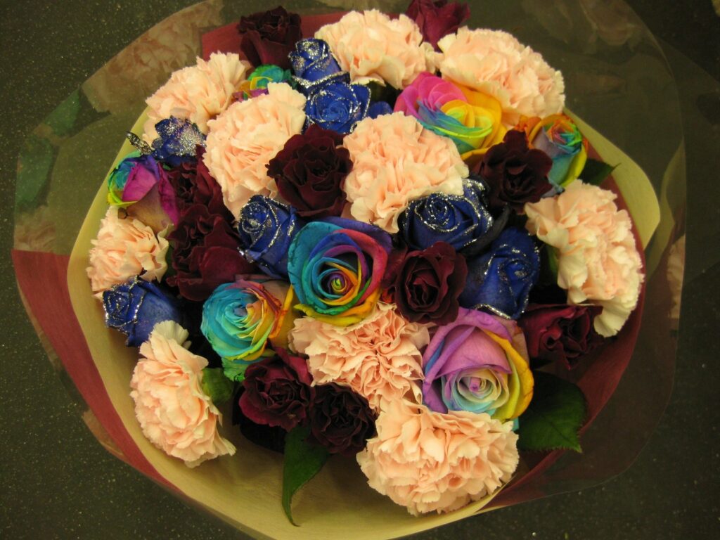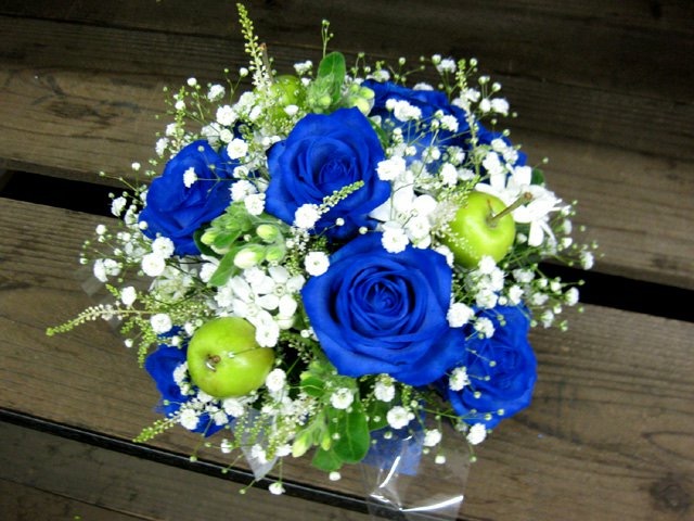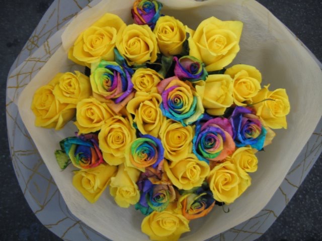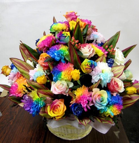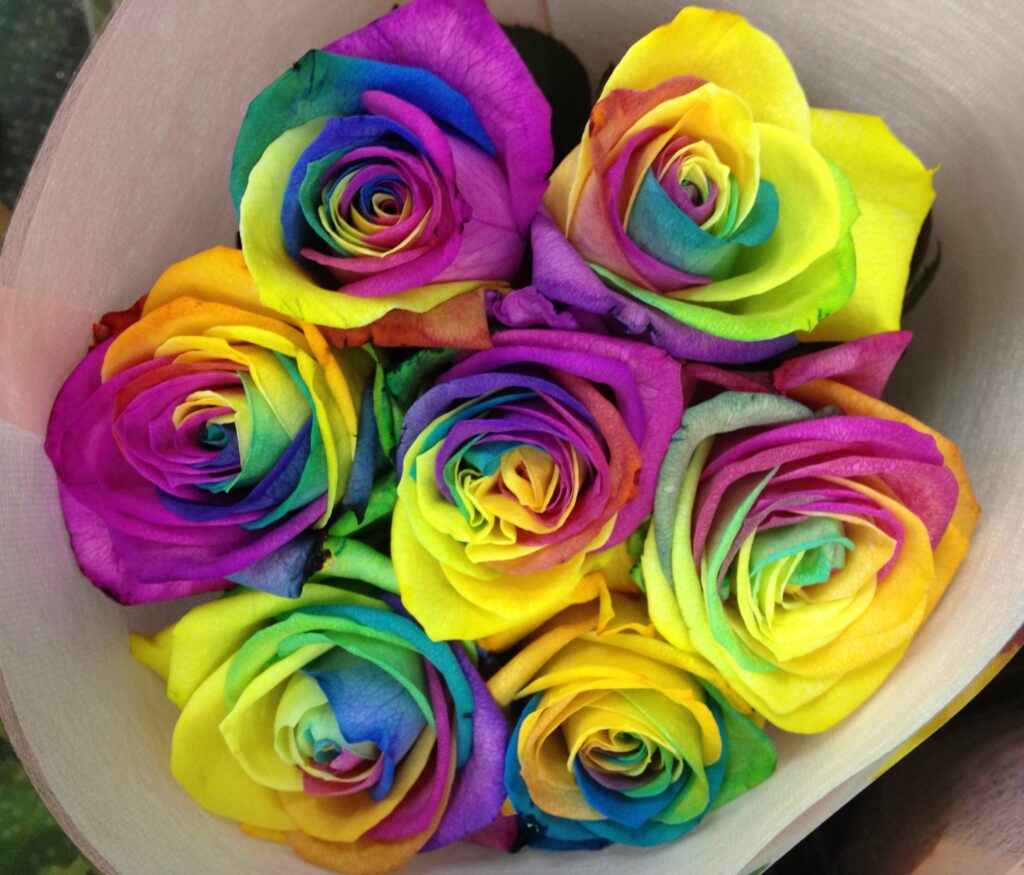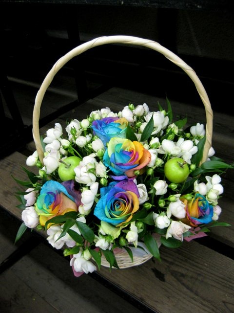 バラのあらゆる色、形、青いバラ、レインボーローズを花束、アレンジでお届けしました。