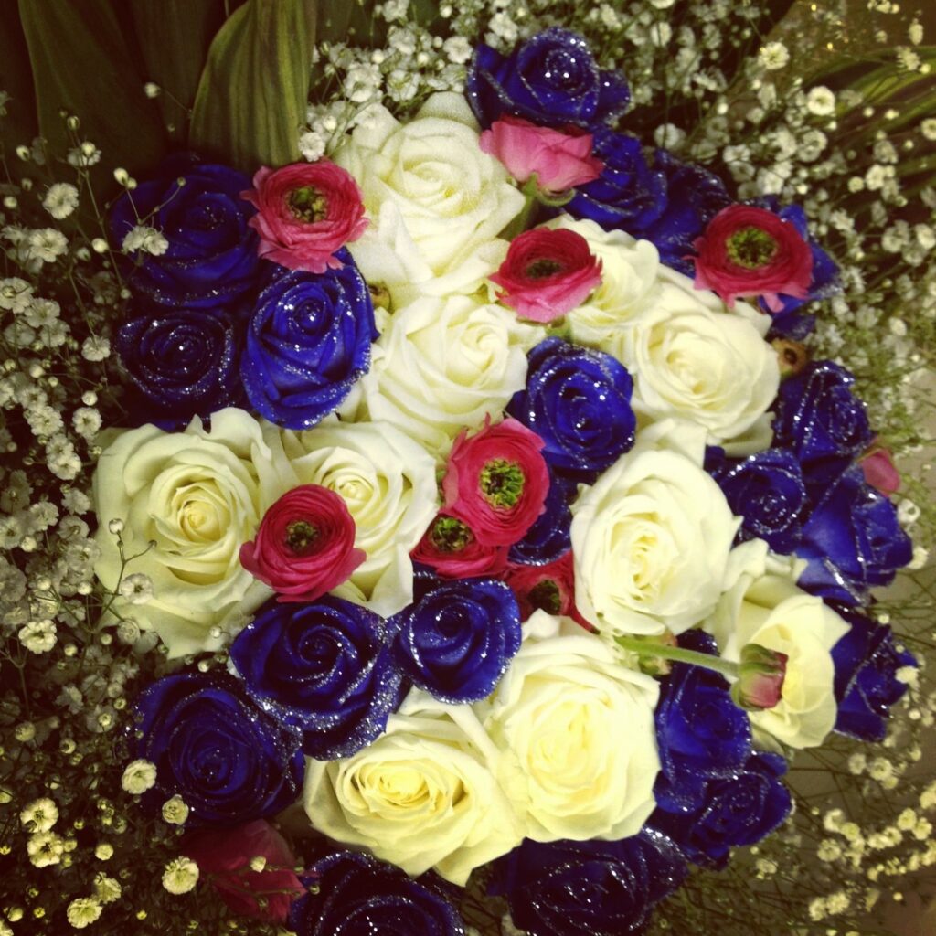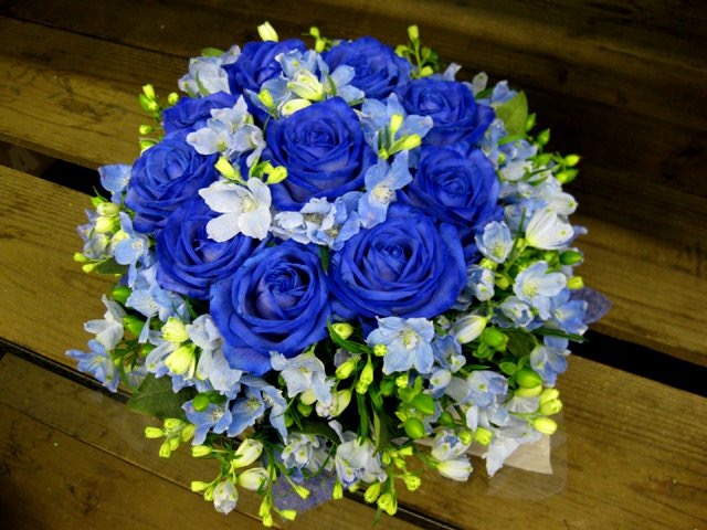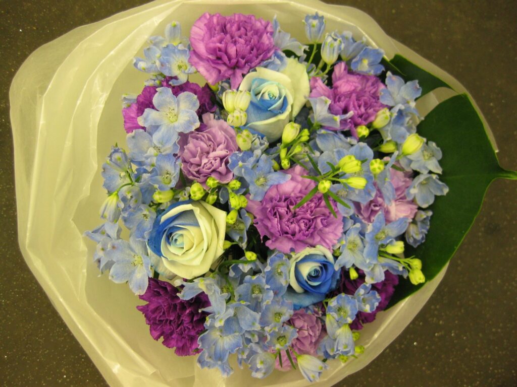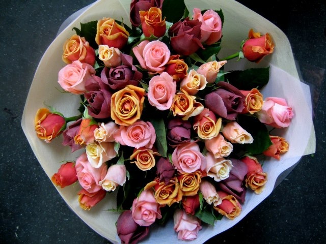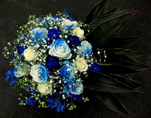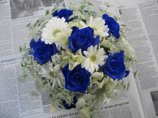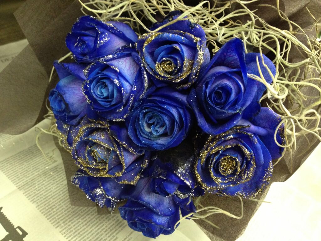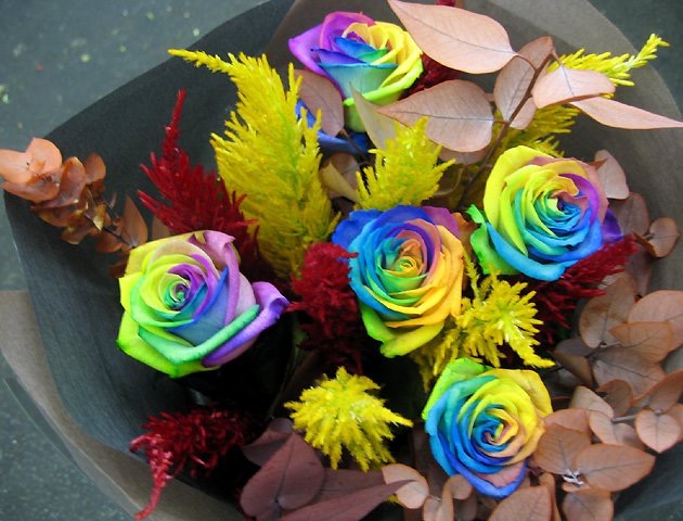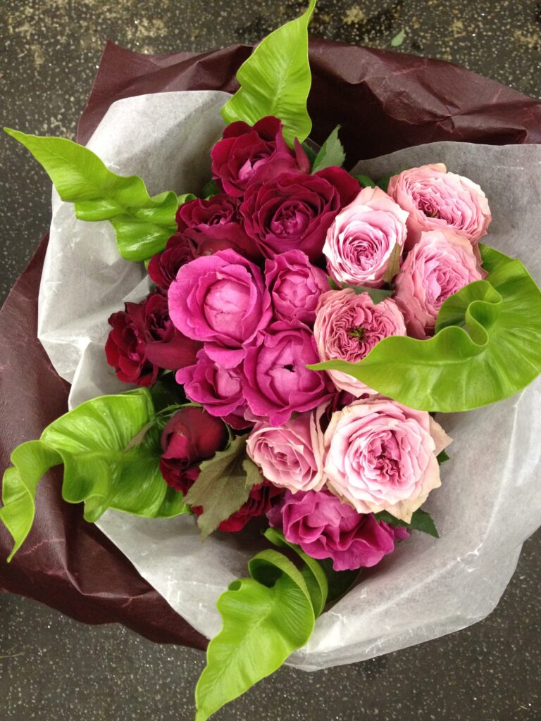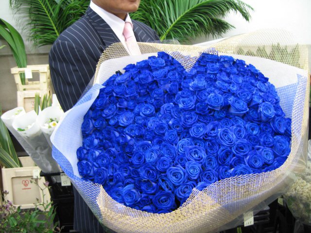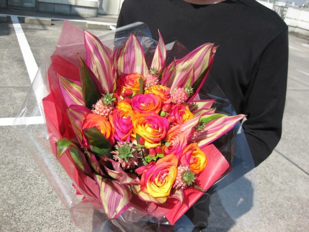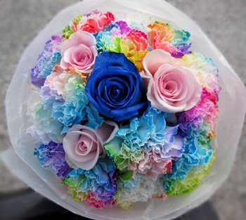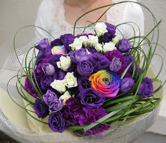 バラのあらゆる色、形、青いバラ、レインボーローズを花束、アレンジでお届けしました。